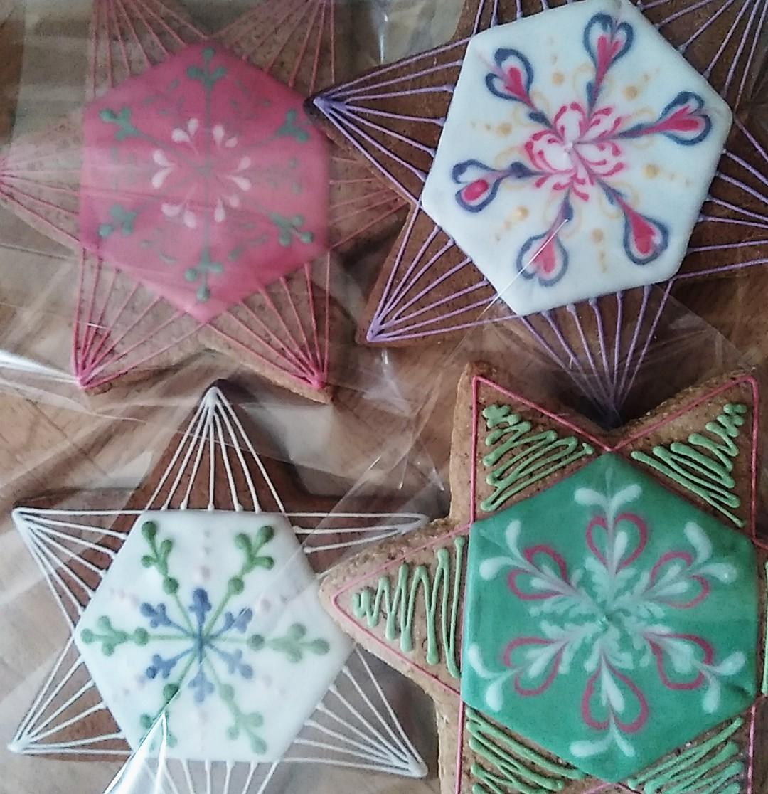 Une grande Étoile de Noël en pains d'épices décorés au glaçage royal, colorant alimentaires naturels
